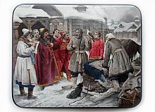 Delivery Of Falcons To A Falconer Assistant At Semenov Fun Court in Moscow In Late 17th Century - box, Fedoskino lacquer painting technique