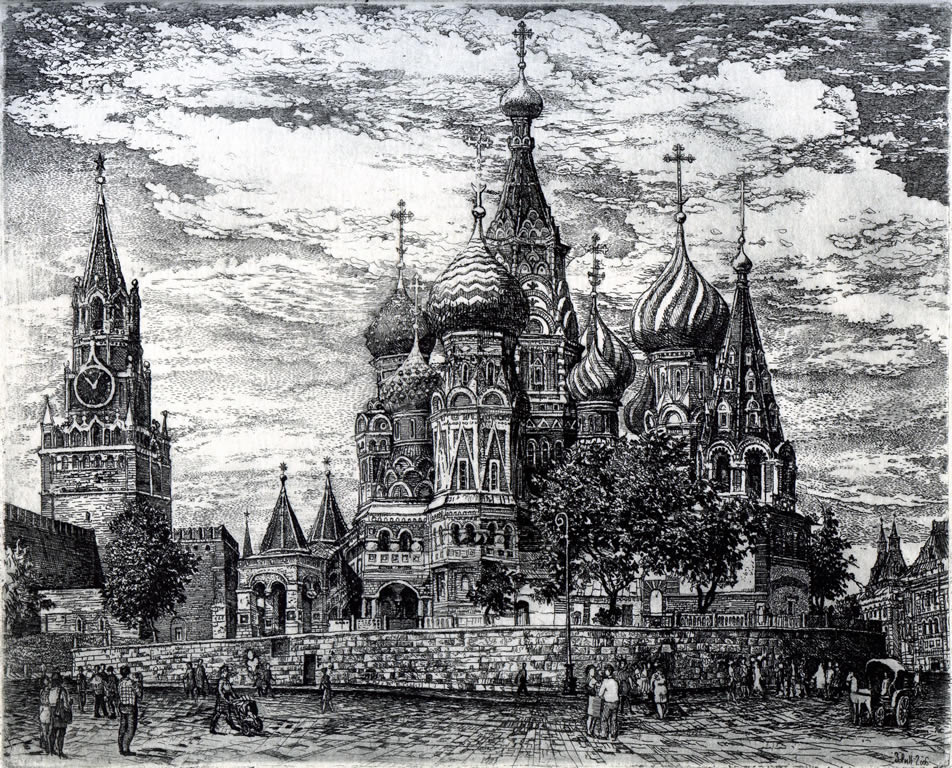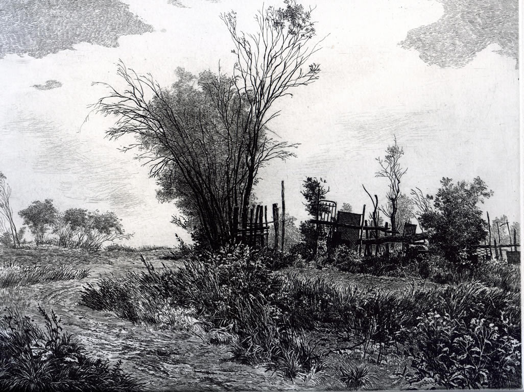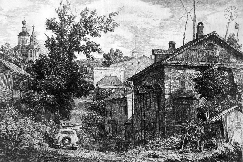Corner Of An Old Settlement - etching, watercolors, toned paper