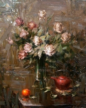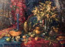 Still Life With Mimosa And Oriental Objects - oil, acrylic, canvas