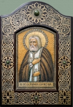 Saint Seraphim Of Sarov The Wonder Maker - pine, cut out birch, oil, serpentine marble, amber by Svetlana Klunduk - icons.